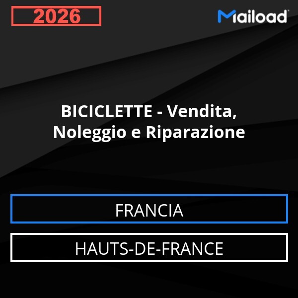 Il Database Email BICICLETTE – Vendita, Noleggio e Riparazione (Hauts-de-France – Francia) contiene 91 contatti aziendali unici, completi di indirizzo email e pronti all’uso per attività di Email Marketing B2B.