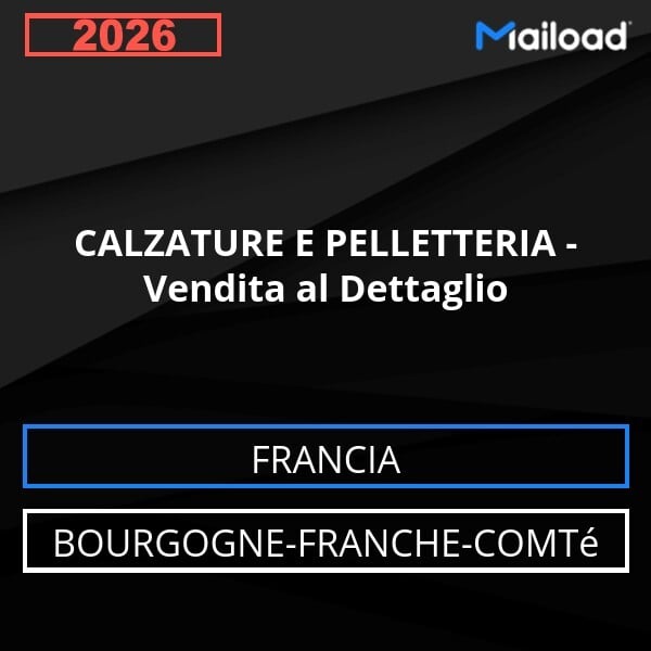 Il Database Email CALZATURE E PELLETTERIA – Vendita al Dettaglio (Bourgogne-Franche-Comté – Francia) contiene 32 contatti aziendali unici, completi di indirizzo email e pronti all’uso per attività di Email Marketing B2B.