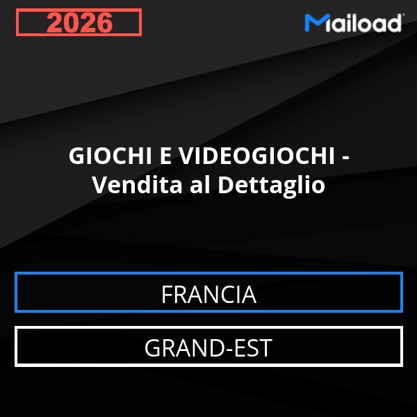 Il Database Email GIOCHI E VIDEOGIOCHI – Vendita al Dettaglio (Grand-Est – Francia) contiene 59 contatti aziendali unici, completi di indirizzo email e pronti all’uso per attività di Email Marketing B2B.
