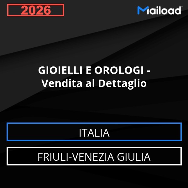 Il Database Email GIOIELLI E OROLOGI – Vendita al Dettaglio (Friuli-Venezia Giulia – Italia) contiene 104 contatti aziendali unici, completi di indirizzo email e pronti all’uso per attività di Email Marketing B2B.