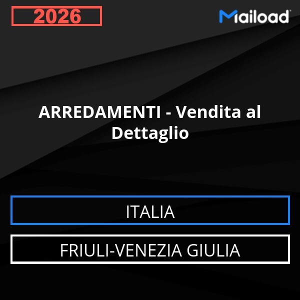 Il Database Email ARREDAMENTI – Vendita al Dettaglio (Friuli-Venezia Giulia – Italia) contiene 244 contatti aziendali unici, completi di indirizzo email e pronti all’uso per attività di Email Marketing B2B.